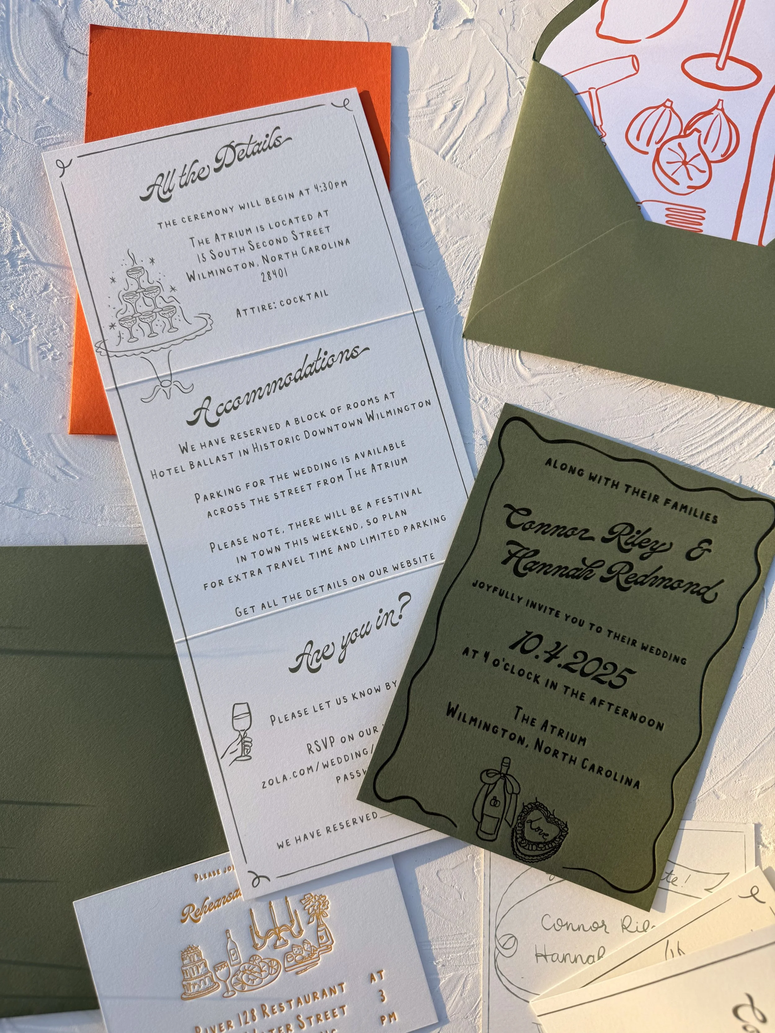 Production of this suite was entirely hands-on. I duplexed mid green paper stock to create a double-thick invitation, sturdy enough to hold a deep letterpress impression. Each details card was carefully folded and pressed to ensure it lay perfectly flat. I custom-mixed an orange ink for the rehearsal dinner invitations to match the pocket envelopes and illustrated liners. Every element was thoughtfully crafted, resulting in a suite that felt cohesive, tactile, and deeply reflective of Hannah and Connor’s vision.