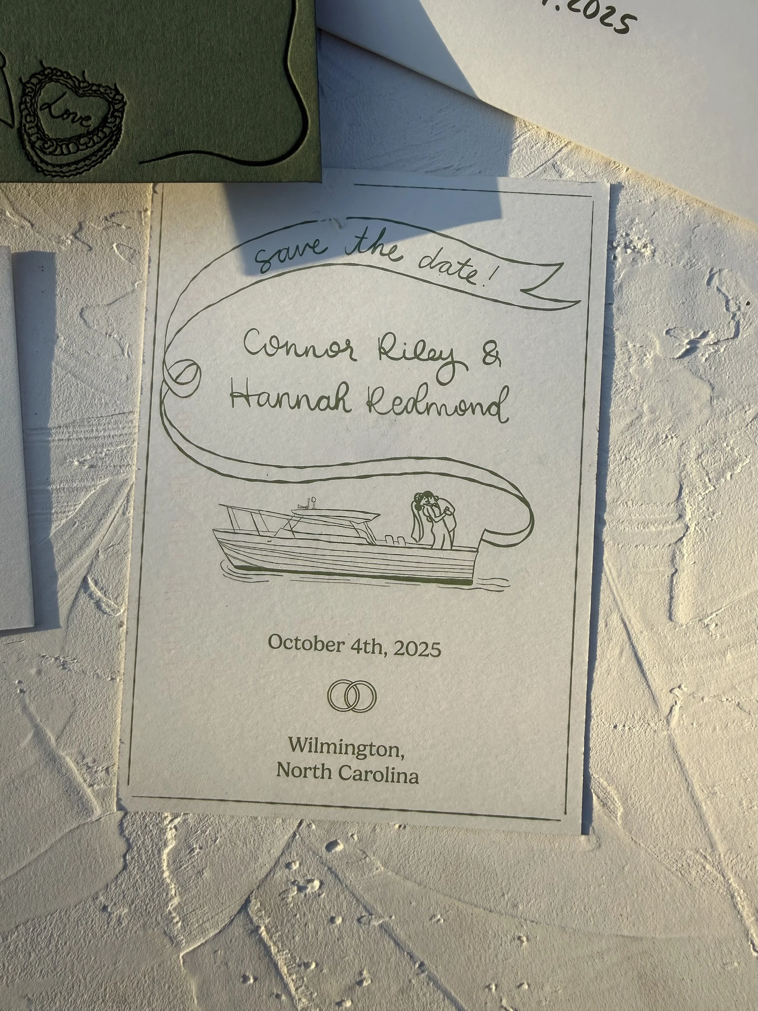 We began with their save the dates, inspired by a meaningful detail from their wedding weekend. Hannah’s father planned to bring his boat down to Wilmington for the welcome party along the Cape Fear River, so we incorporated it into the design with a custom illustration of the couple aboard the boat, complete with a flag reading “save the date.” It was playful, personal, and perfectly set the tone for what was to come.